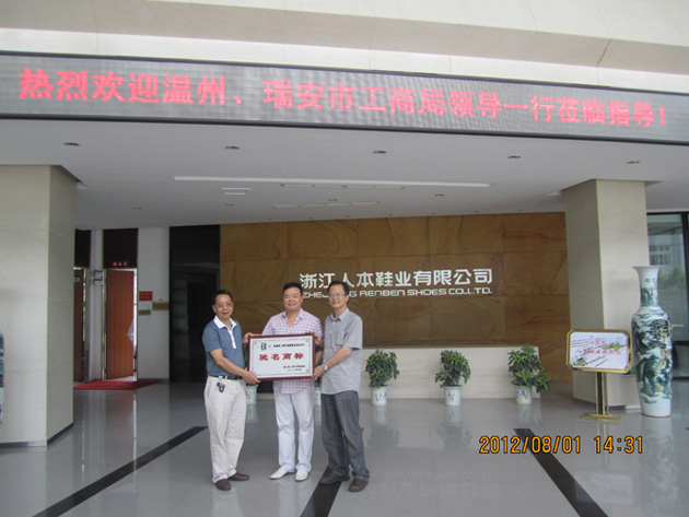 2012年5月,我公司商標被國家工商行政總局認定為中國馳名商標,8月1日溫州及瑞安兩級工商部門領導到我公司授牌。我公司多年來堅持以質量為重,扎實推進品牌建設,人本商標及產品在市場享有盛譽,這次喜獲行政認定馳名商標,為人本鞋業的發展奠定了更為堅實的基礎。